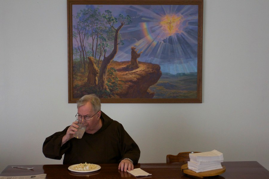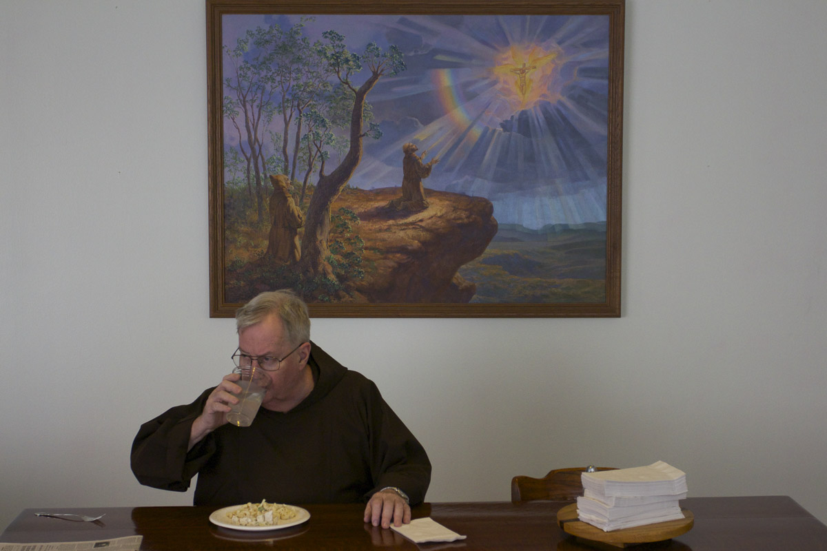 Eating a breakfast of macaroni and cheese in the dining room that he shares with 8 other friars.